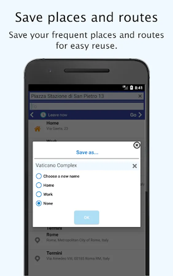 Save your places as Home or Work or even with any custom name, for example to your contact name, school, hotel, university.