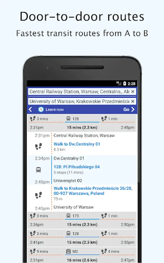 Search places or location of interest and get nearby departures to that place. Search and get transit route to the places, from your location or between any two locations.