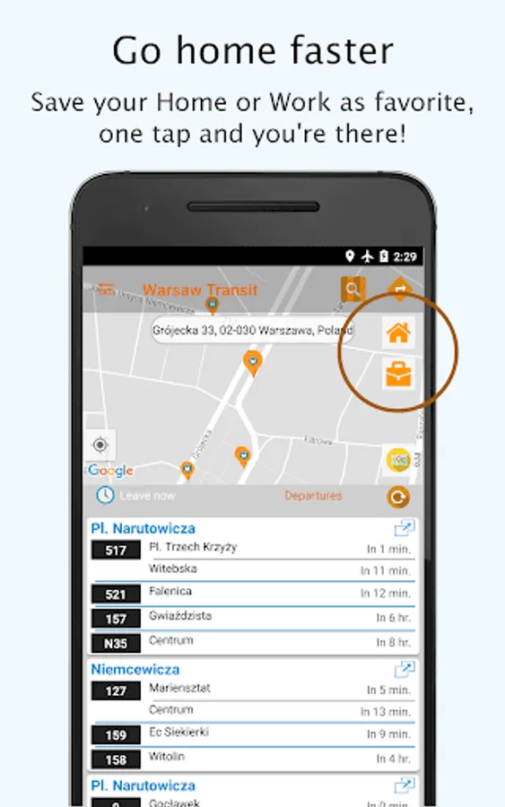 With dedicated shortcut button to home and work, get public transport route to your destination in just one tap with estimated time and delays. Pick your current location on the map and set as Home or Work in single step. That's easy!