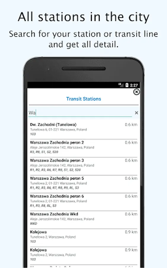 Complete searchable list of all stations with addresses and connections in the city and region. Search for any line, check all stops and jump to any stop - All available offline.