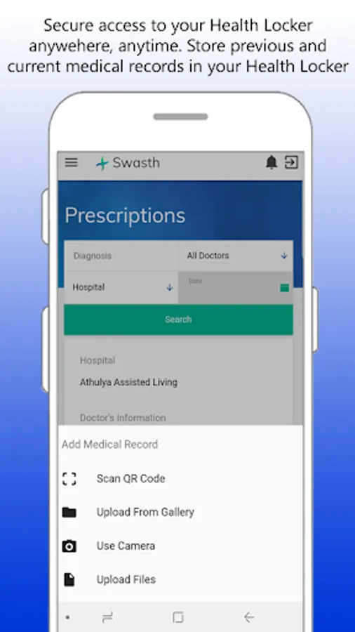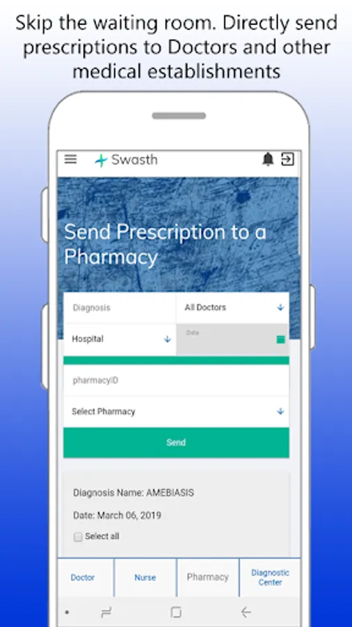 Swasth includes patients being able to book appointments to nurses entering vitals electronically, doctors prescribing electronically, communicating through video chat and online messaging, receiving diagnostic reports via the Swasth app and sending prescriptions to Swasth partnered pharmacies. You can also send your various records to various health establishments. Swasth serves as a health locker where patients can upload and store their various previous health records.