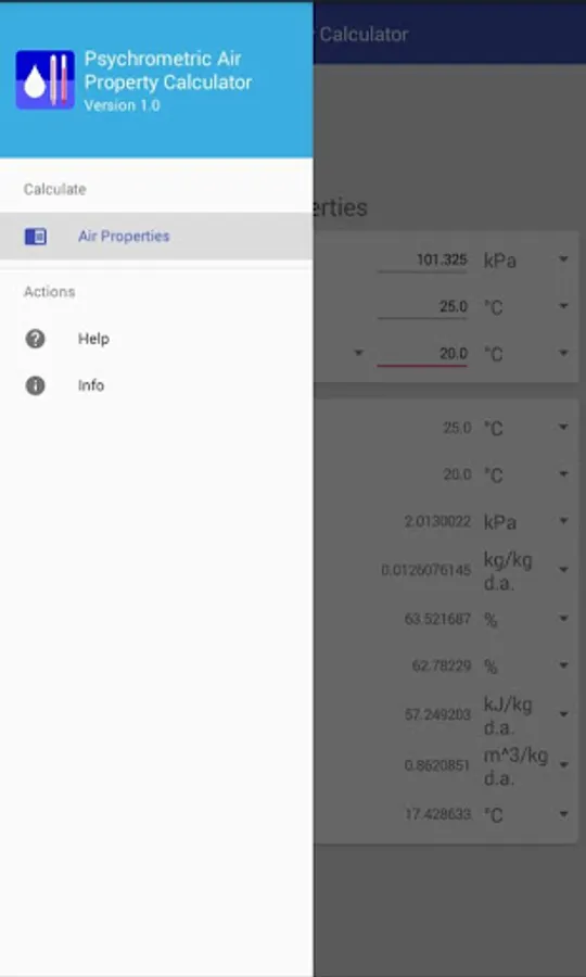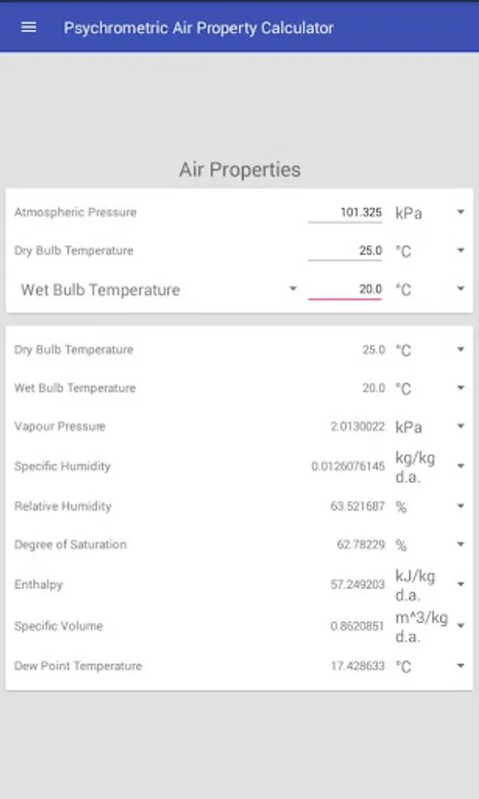 Welcome to Psychrometric Air Property Calculator. This app is Air property Calculator. You can get all air property by giving any two known property.