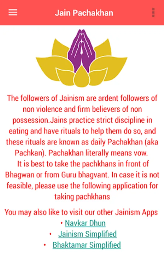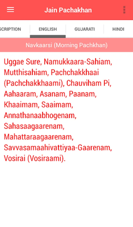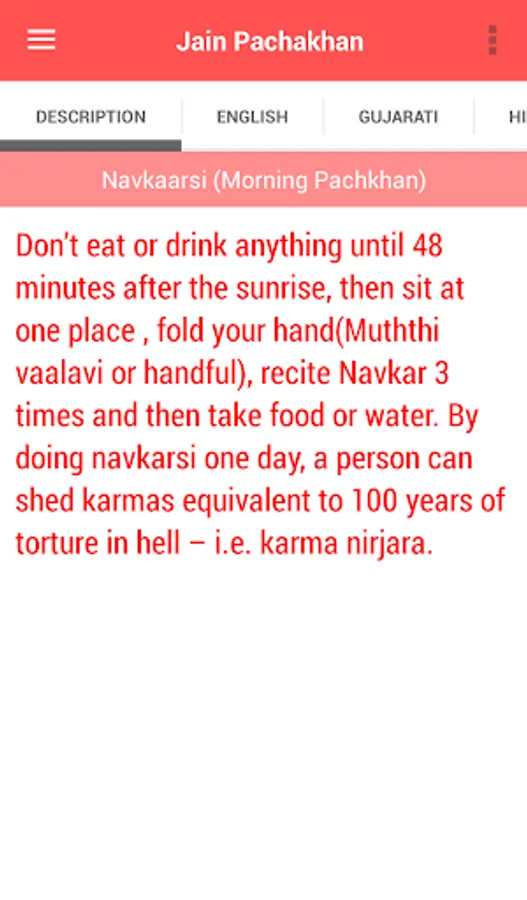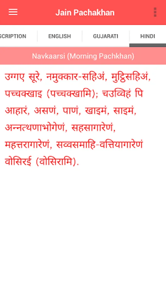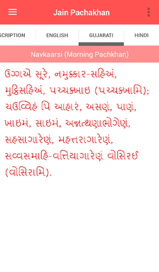 Jain Pachkan app provides you with the Pachakhan text handy in 3 different languages (English, Hindi and Gujarati) for all the vows to be taken in morning and evening