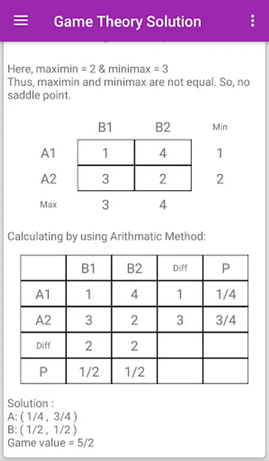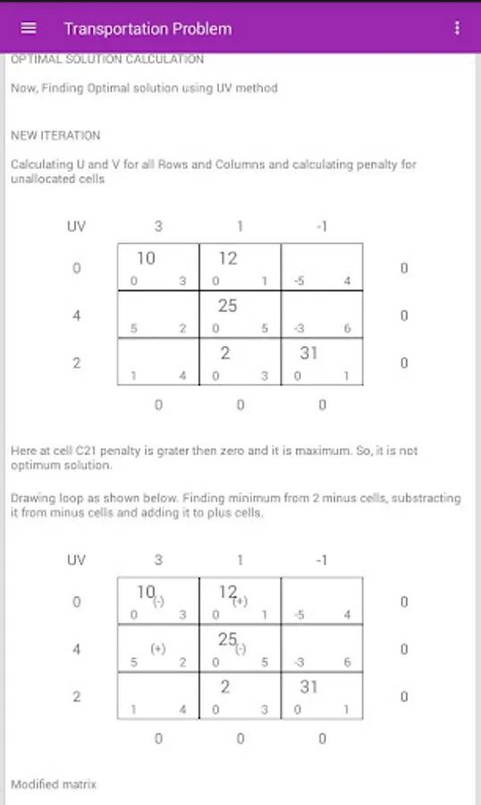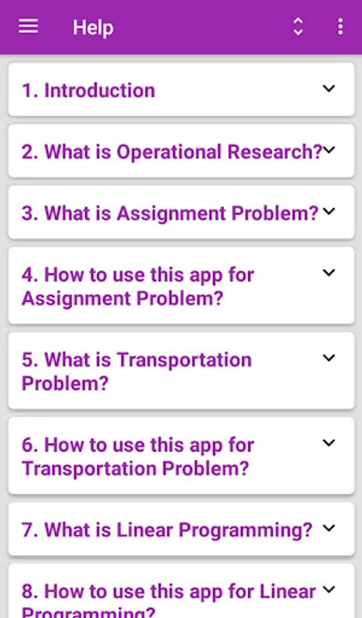 Welcome to Operational Research app. This app is Solver or Calculator. It is useful to solve following problems:(1)Assignment Problem (2)Transportation Problem (3)Linear Programming (4)Sequencing Problem (5)Game Theory. This app will solve all variety of these problems as well as shows STEP BY STEP solution.
