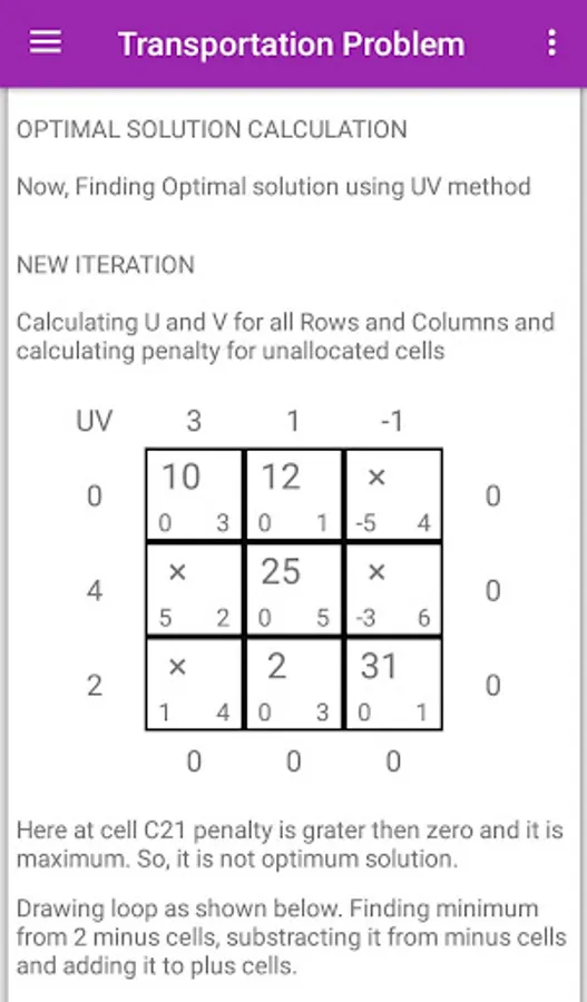 -View all steps of initial solution and optimization steps along with marking and looping in Transportation problem.