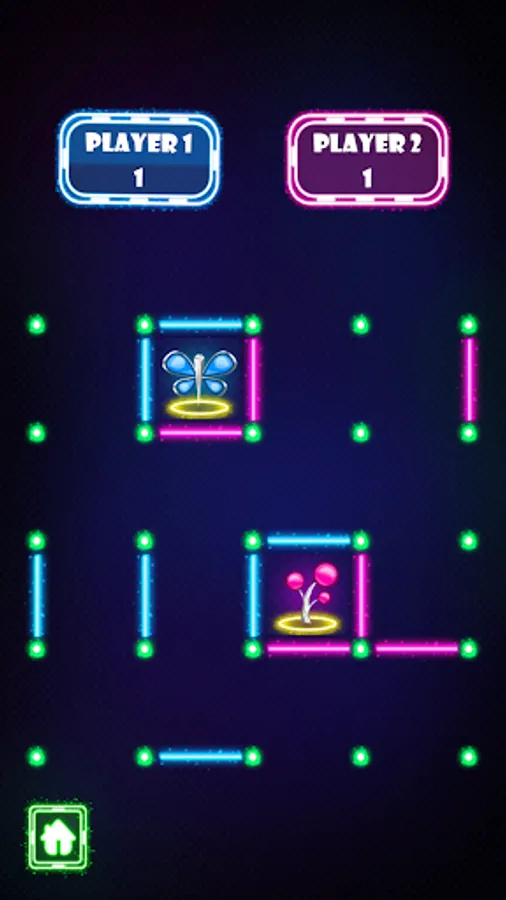 The game is played by two players, alternating in turns. In his turn, a player draws a line between two dots. If a player makes a square, he scores and play again.