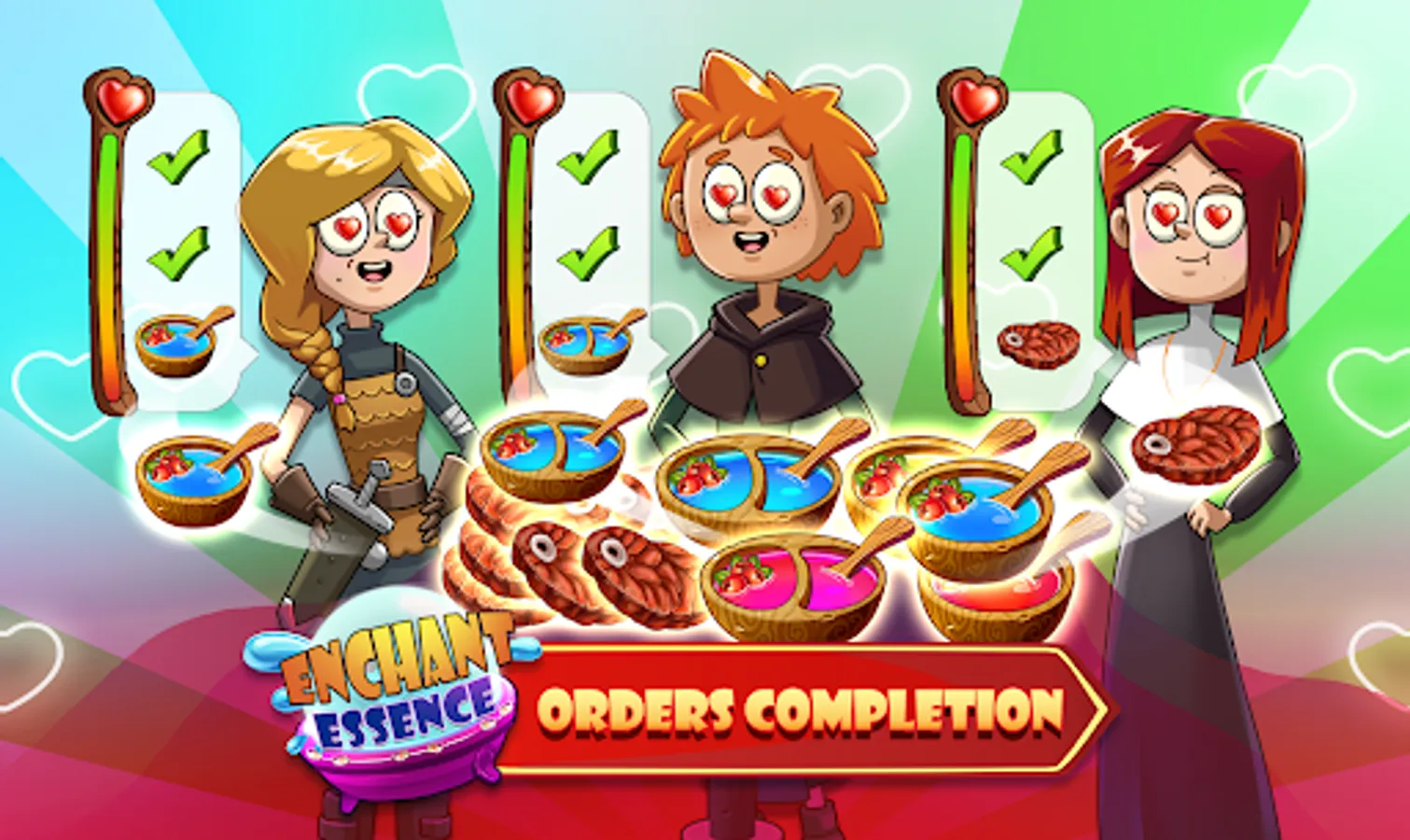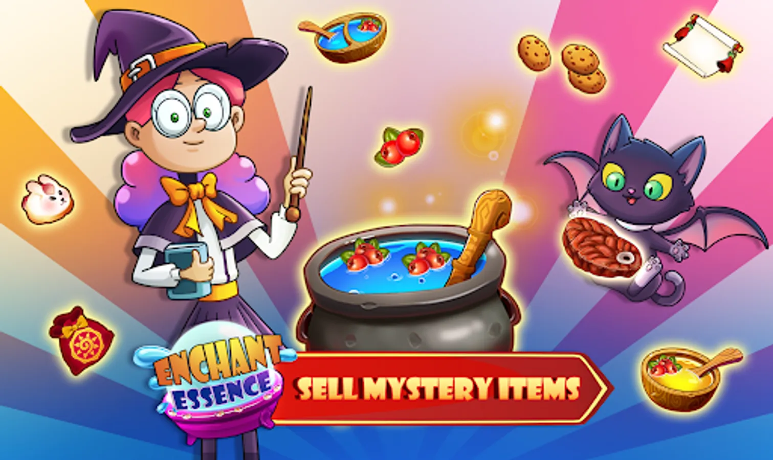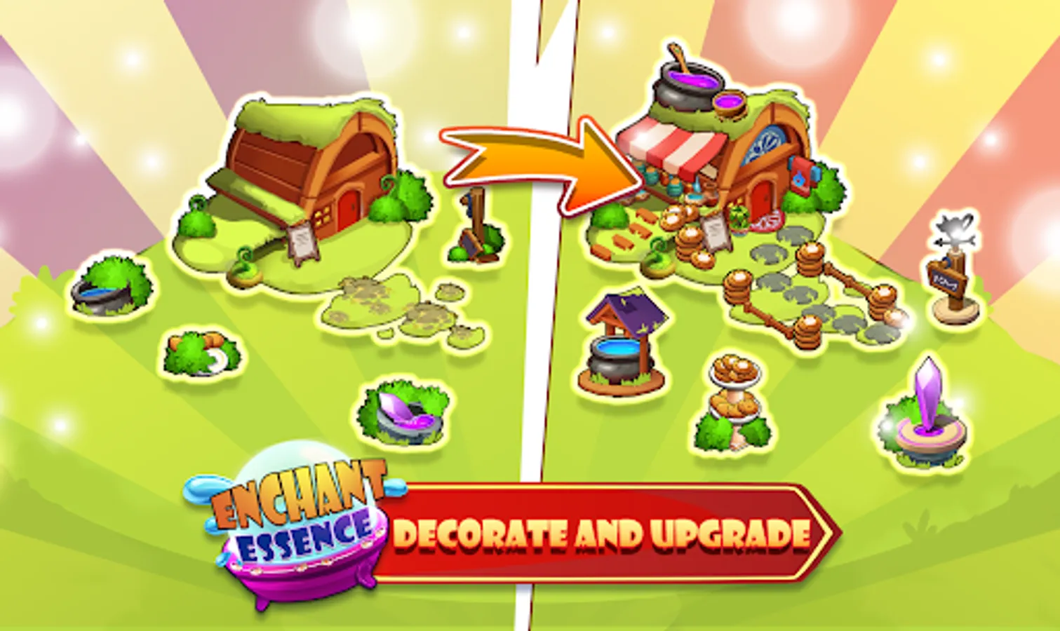 Welcome to the fantasy world of Enchant Essence! Here, you will combine different colored essences to create special essences, grill fresh meats into delicious steaks with witch cats, or craft magic scrolls, magic bags, and many other items. Complete items and deliver them to customers in a limited time, to get coins and upgrade your shop! Adventure through different lands, with unique items!