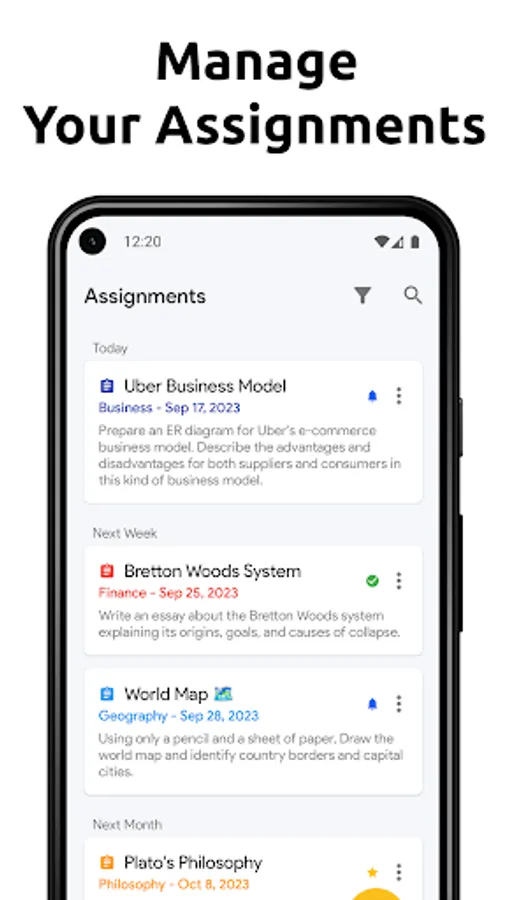 School Planner is designed to help you track all of your assignments easily and intuitively. You can either order your assignments by date, course, or priority or sort them by completed or incomplete.