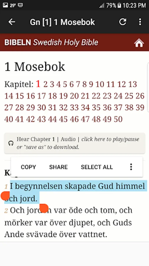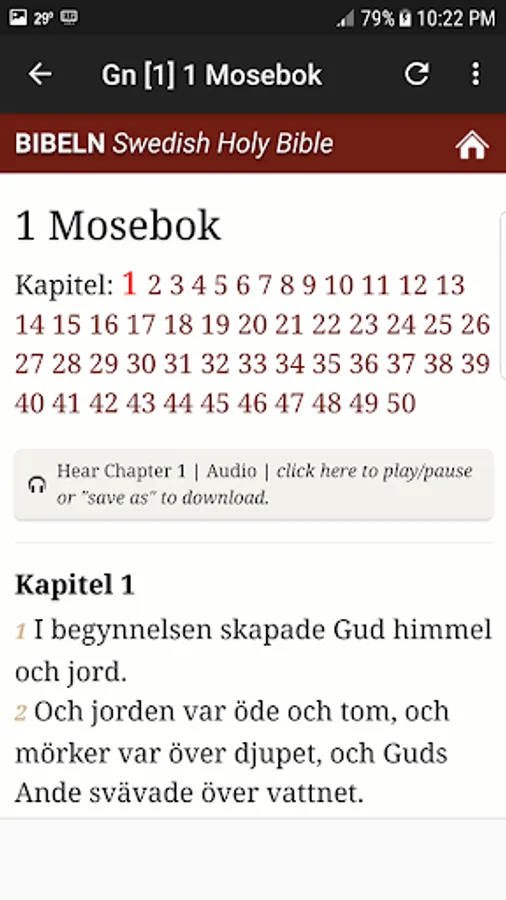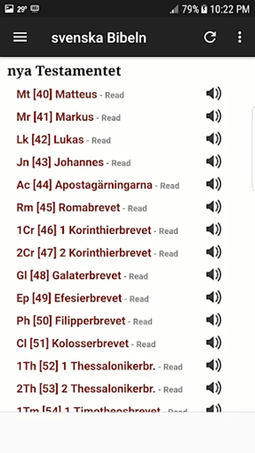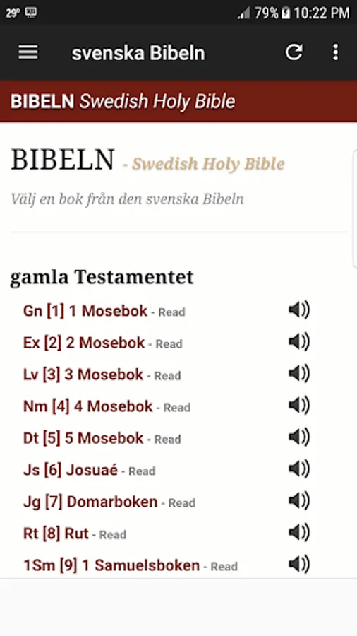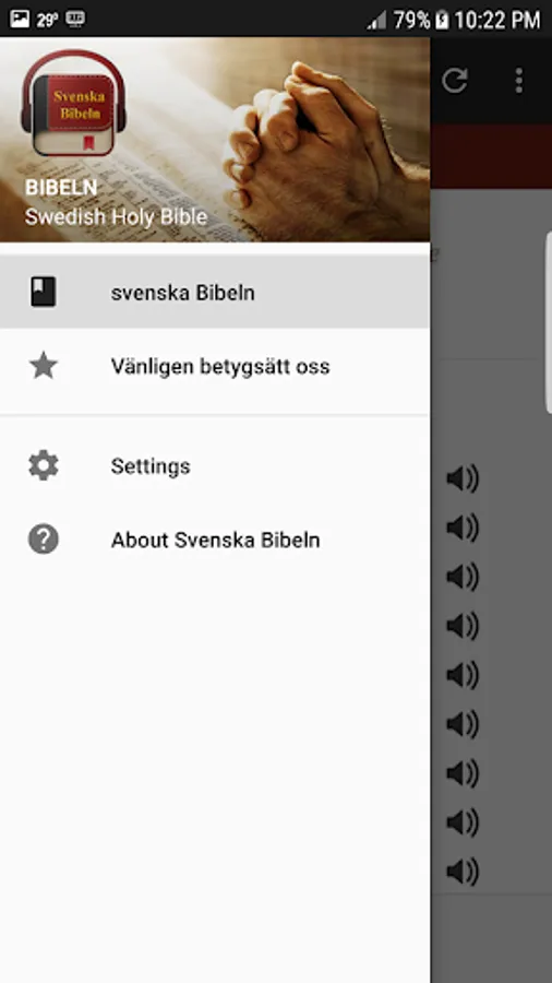 Swedish Bible application is your place to read and listen to the audio version in Swedish language for free. The application will read the verses for you in Swedish language. This Swedish Bible app comes complete with all scriptures of Old and New Testament. Also include Swedish Bible text version for reading. You can read and hear the words of God at the same time. You can read Bible offline. If you android device is connected to internet you can listen to streaming Swedish Bible. With Background player function, you don't need to open the app every time to listen your favorite bibles. User interface is designed for easy navigation. Very easy access to all Chapters of Holy Bible in Swedish. You can share this app with friends and family via text message, social network or email.