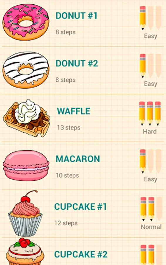 In simple steps allow you to perform fantastic drawings, just take a paper and a pencil, choose the dessert you like and follow step by step instructions. It is very easy to use.