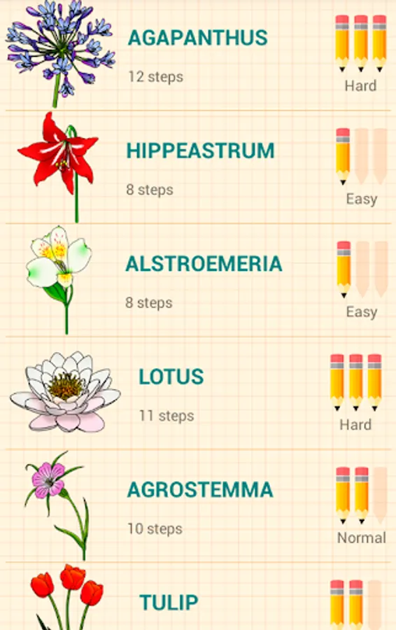 In simple steps allow you to perform fantastic drawings, just take a paper and a pencil, choose the flower you like and follow step by step instructions. It is very easy to use.