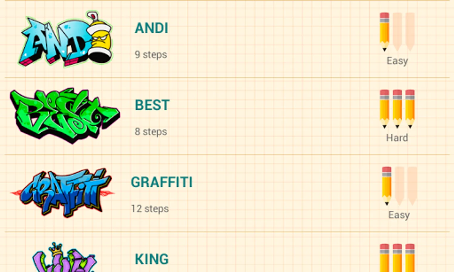 In simple steps allow you to perform fantastic drawings, just take a paper and a pencil, choose the graffiti you like and follow step by step instructions. It is very easy to use.