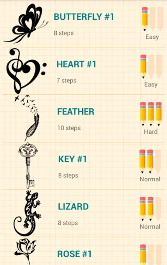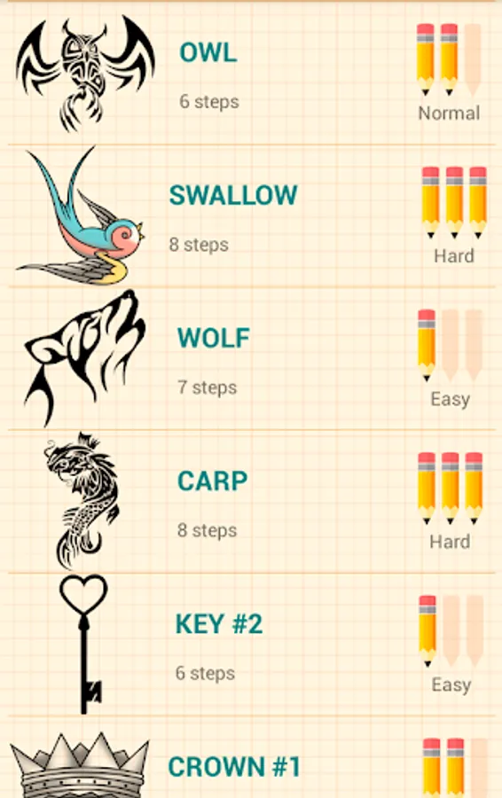In simple steps allow you to perform fantastic drawings, just take a paper and a pencil, choose the tattoo you like and follow step by step instructions. It is very easy to use.