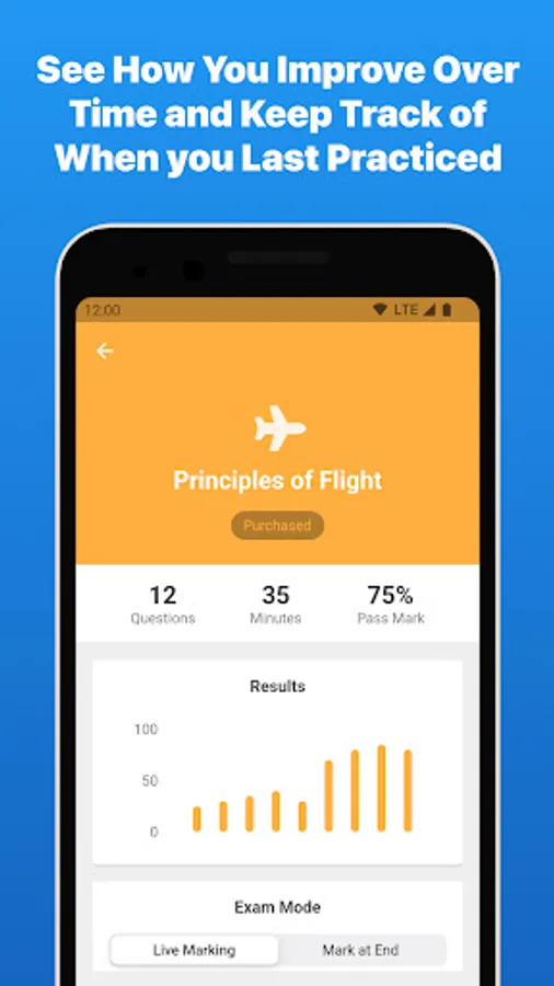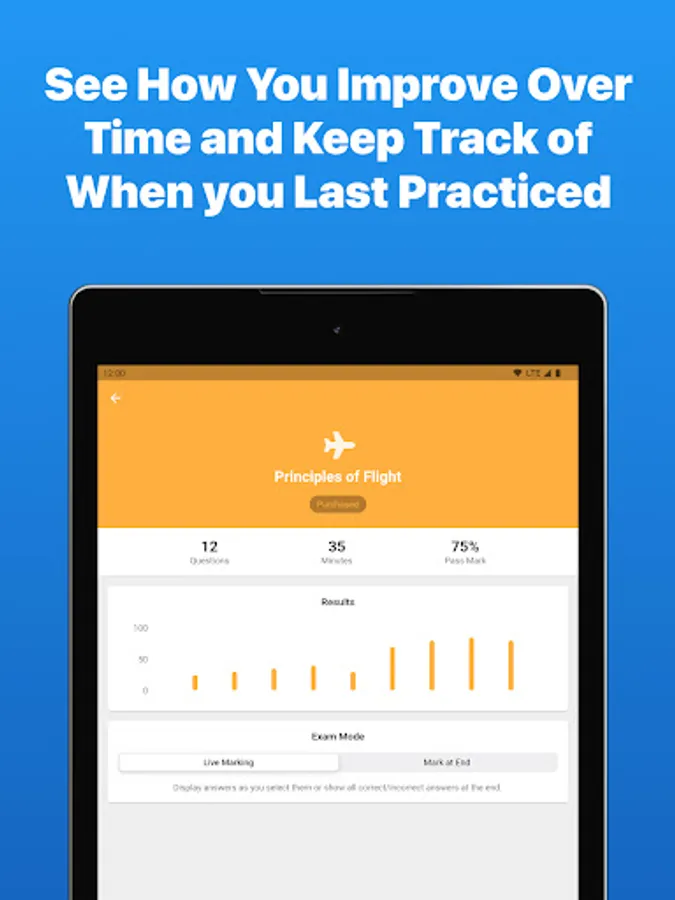 All your practice results are saved locally and displayed on a chart so you can see how your results are trending over time. PPL Exam Preparation also displays all you topic averages right from the topic library screen so that you can quickly identify which topic needs more work.
