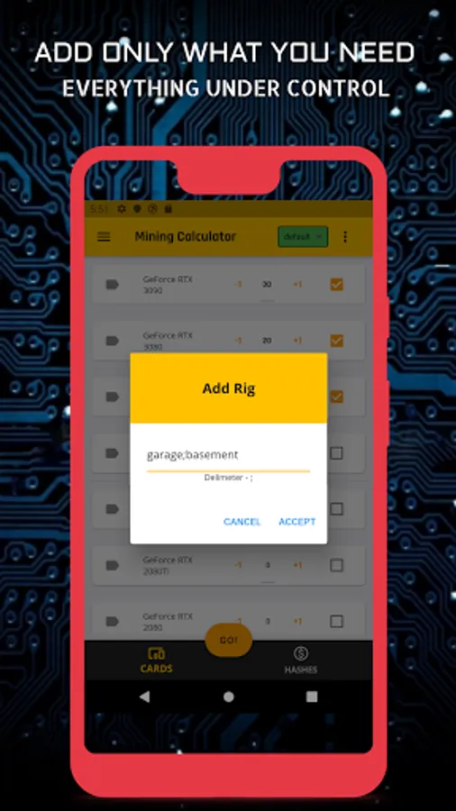 Mine ether (Ethereum ETH), Monero (XMR) or something else, on Nvidia GTX or AMD Radeon cards, anyway, this the app is for you. Cards, rigs and hashes - all calculations are in your pocket now. Use our mining tool with flexible and truly user-friendly features.