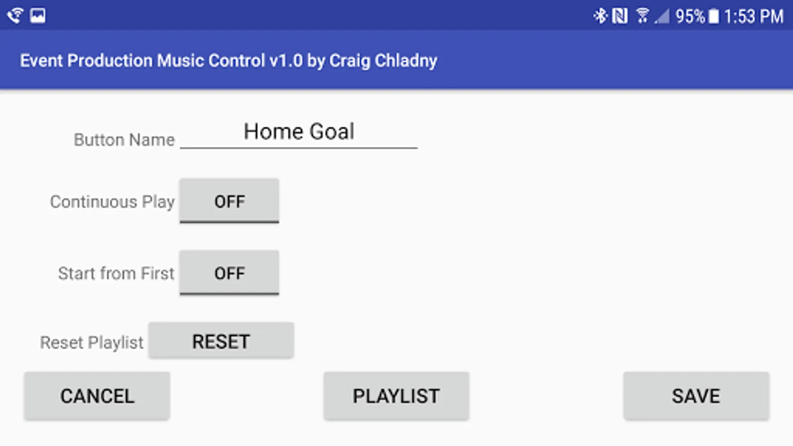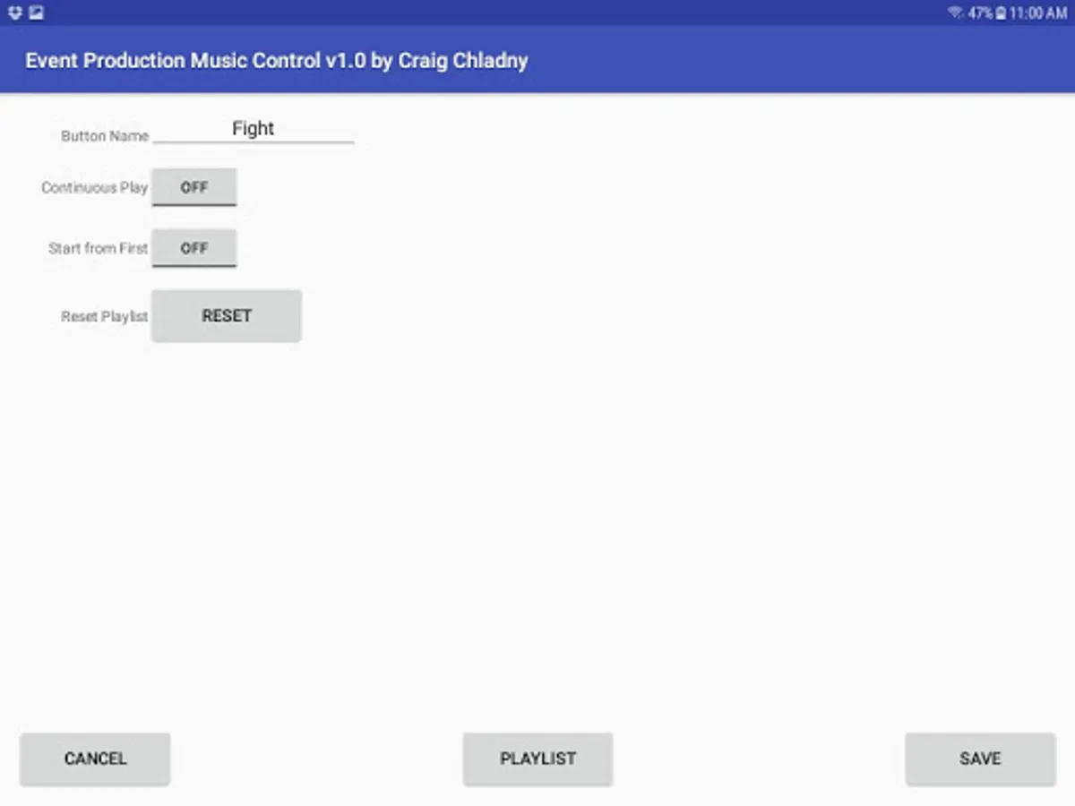 Using Event Production Music Control you can set up up to 16 playlists (12 on a 7" tablet or smaller phone) and control the music with smooth fade in's and out's to make everything sound coordinated and professional. You can set individual start-in and fade-out times for each song to have them start and end where you'd like. Each playlist plays one song at a time unless you choose the Play Continuous option for that specific playlist.