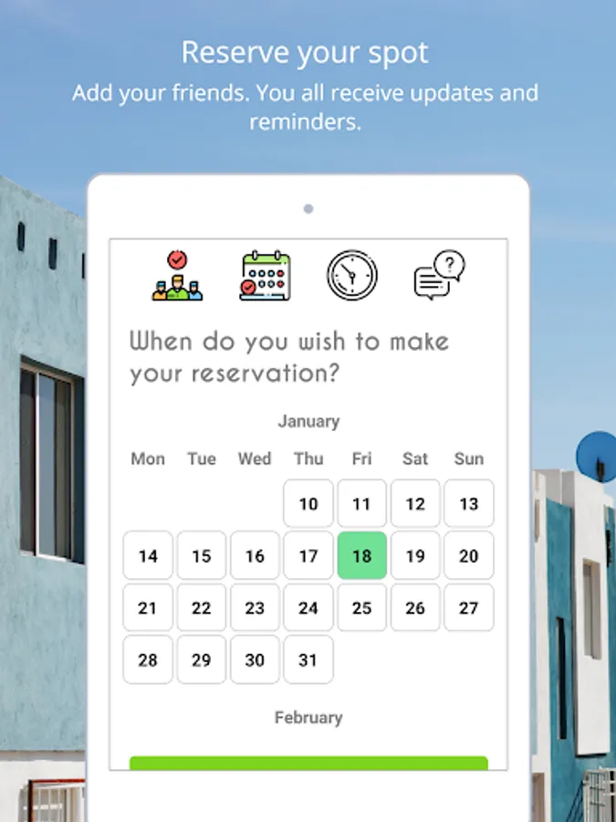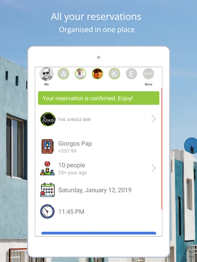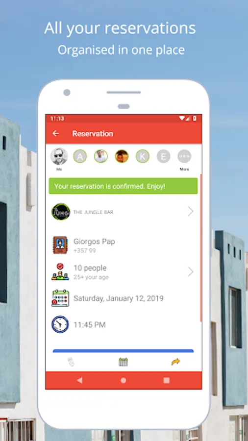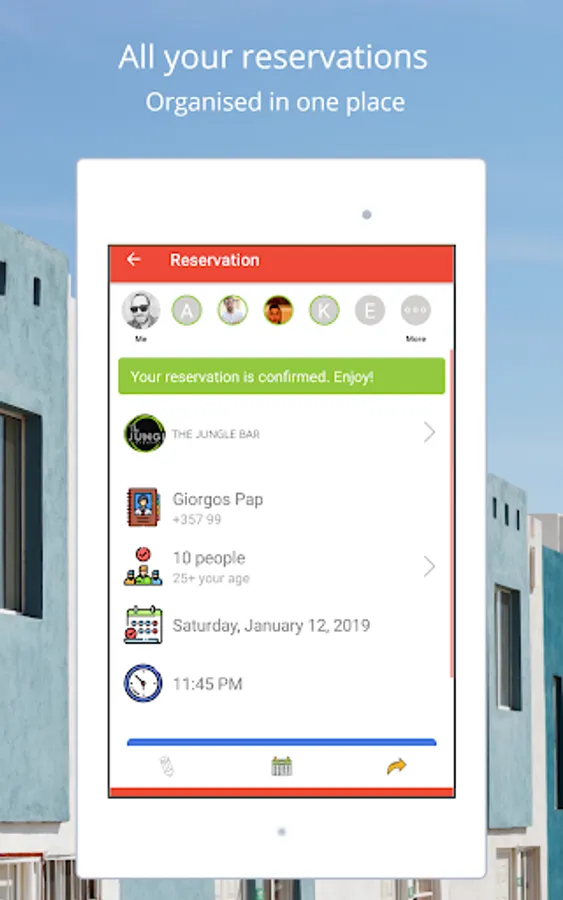 Make your reservation in just three taps and wait for a confirmation. How will your friends be notified? Simply by tagging them in the reservation. Everyone will be notified if the reservation is accepted or if the venue is full and you need to book somewhere else. And since your friends are using the app, they all know directly when and where to go (location information).