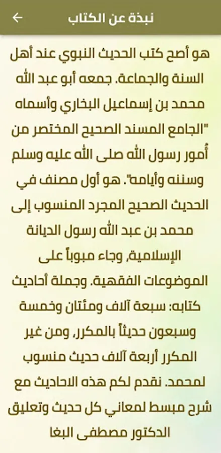 The Sahih Al-Bukhari pdf application contains an overview of the book and you can read the book with the letters increasing and decreasing in order to suit your eyes and vision.