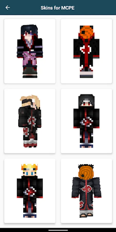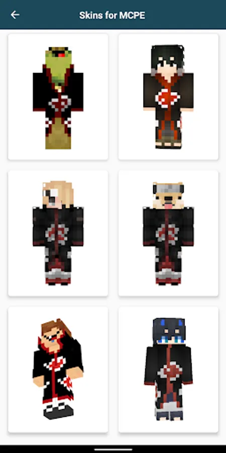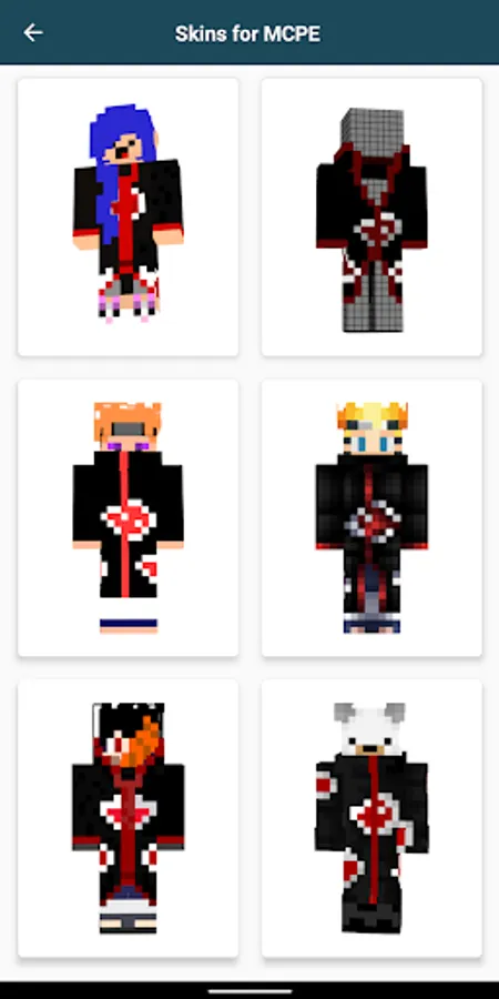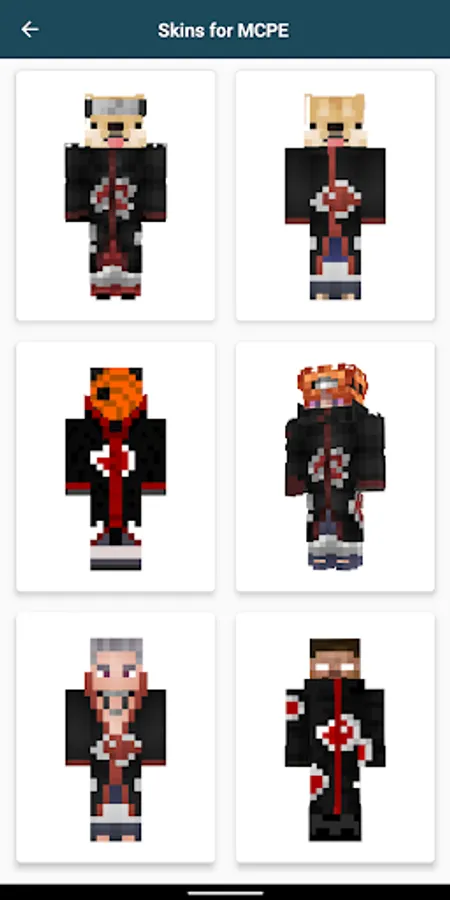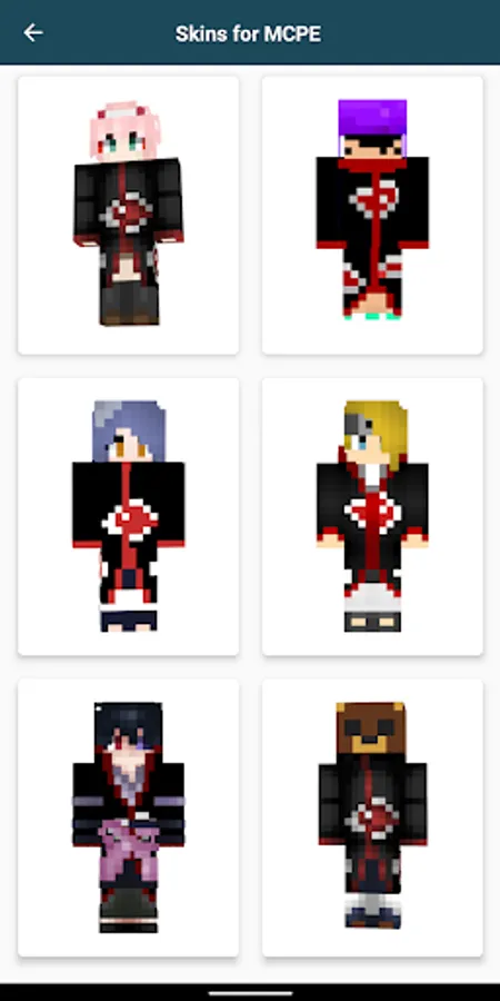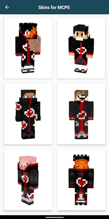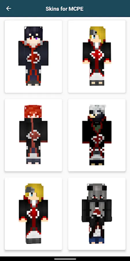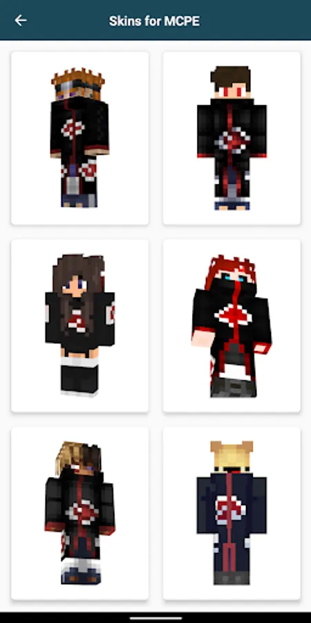 Akatsuki skins for minecraft pocket edition with high quality. This is a skin pack developed by akatsuki anime fans for minecraft pe fans. You can find your favorite skin and use it every day. Akatsuki skins are part of the very popular anime skins