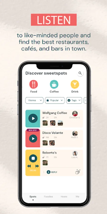 sweetspots enables foodies to share food and drinks recommendations using micro-podcasts.
