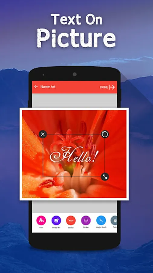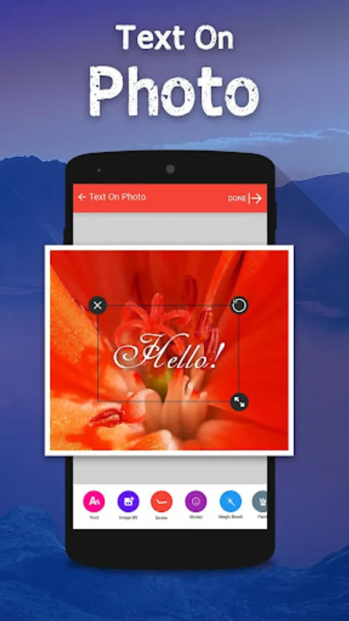Text On Photo opens the world of art for your imagination and gives you the opportunity to play with your own unique skills and ideas.