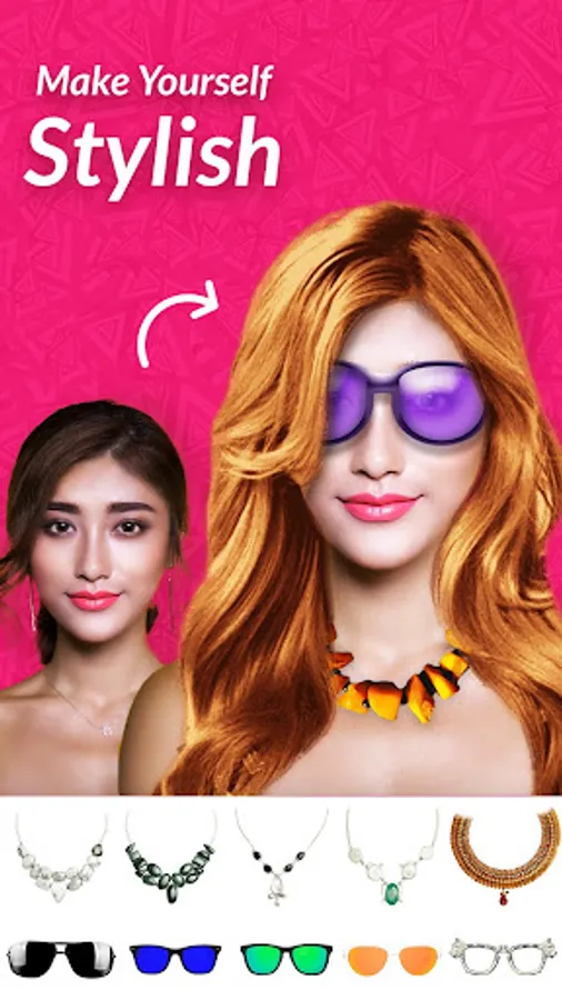 Try the latest jewelry and sunglasses on your photos to be ahead of the latest trends in fashion. Be the trendsetter glam. Add a hairstyle sticker and change the hair color to suit your face, keep trying different colors like hairstylist, beauticians or hairdressers do at different salon or beauty parlor.