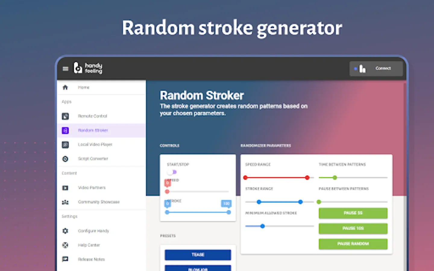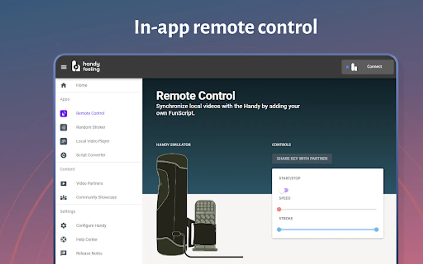 The app includes remote control for the Handy, a random stroke generator, local video playback, along with a list of video content partners.