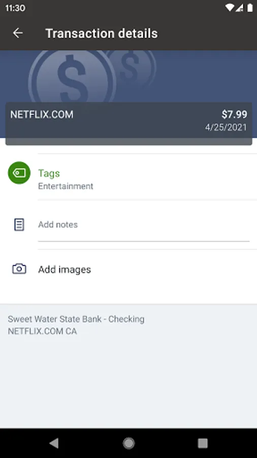 -Keep your transactions organized by allowing you to add tags, notes and photos of -receipts and checks.