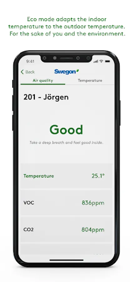 Med ett inomhusklimatsystem från Swegon kan du med appen se hur ditt inomhusklimat är och lära dig mer om det.