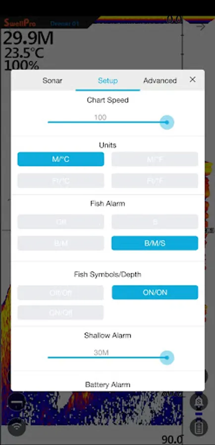 Get notified when the Dronar detects fish underwater. Set the alarm to notify Small/Medium/Large fish.