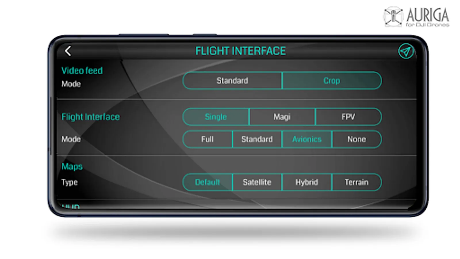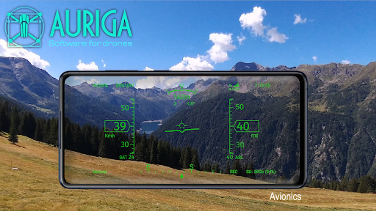 By Auriga interfaces you will be able to control your aircraft by your mobile all the flight parameters through an innovative HUD display and have a more immersive feeling through the FPV camera Head Tracking feature.