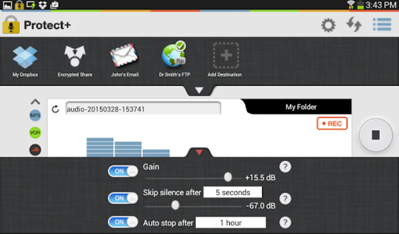 ★ Automatically encrypt and save/upload your audio files to a favorite destination when recording is stopped.