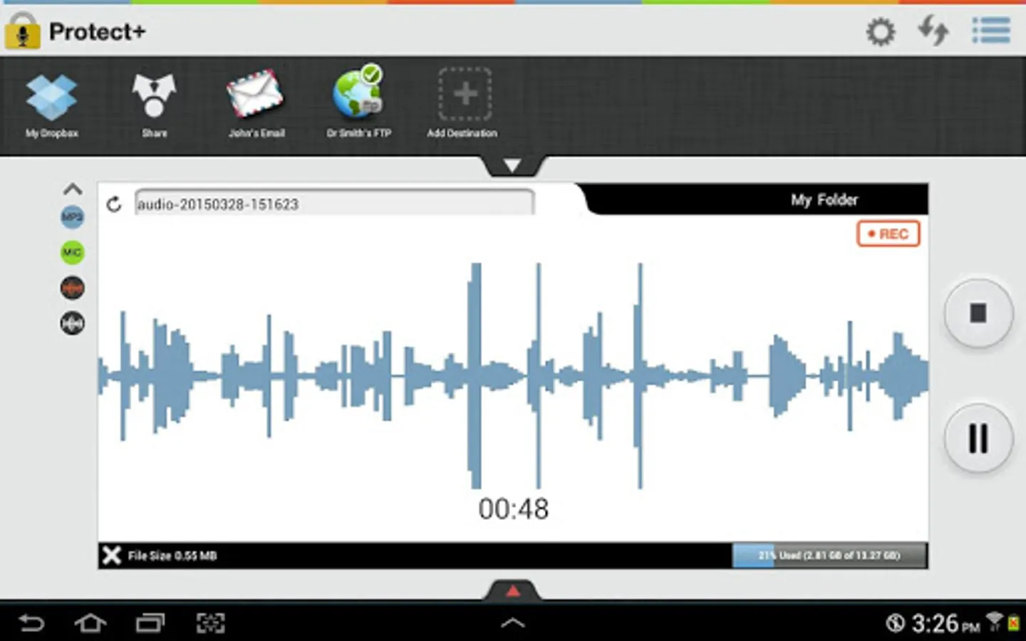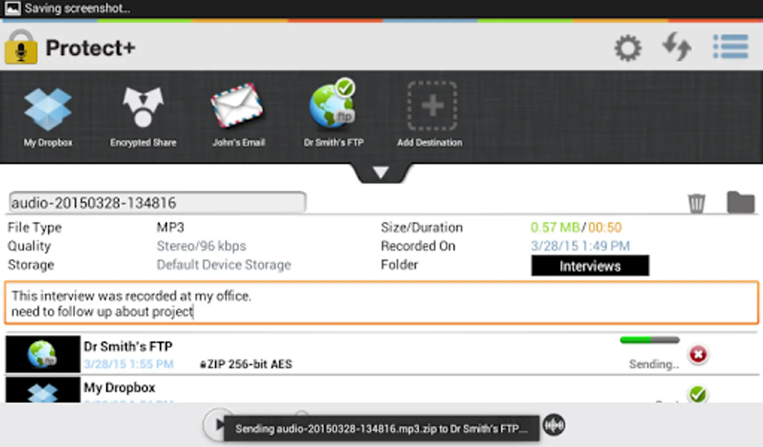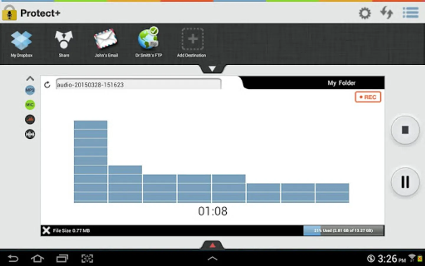 Record. Encrypt. Send. All with a single touch. It's that easy! Protect+ Voice Recorder with Encryption is a full-featured recording app with a simple, elegant interface. Whether you're a doctor, lawyer, or student... or in business or the media... or anyone who needs to record or dictate voice or other audio, there is finally a solution that makes recording, encrypting and uploading those important files quick and easy. Download Protect+ today and get these features: