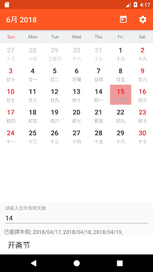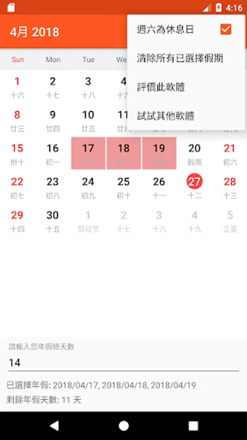 2. The monthly calendar mode presents vacations, supports the Gregorian calendar, and shows the lunar calendar!