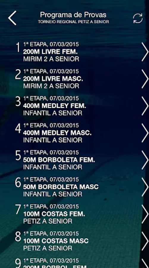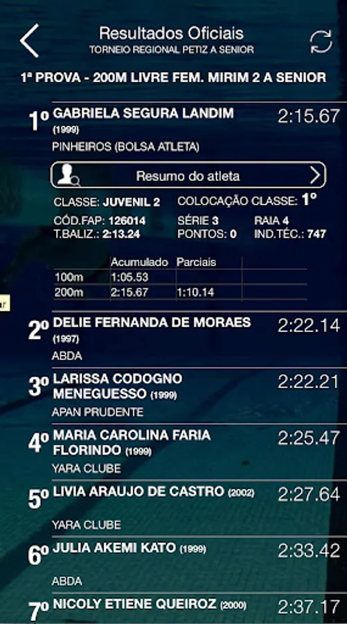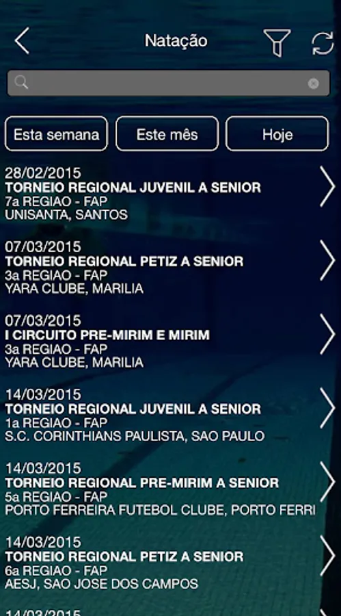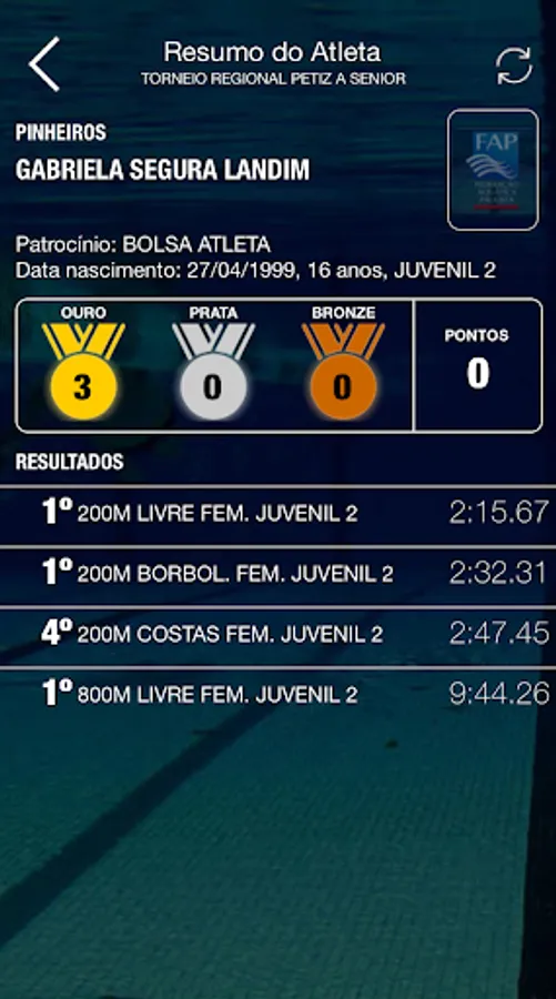 Official app of the Aquatic Federation Paulista providing results, calendar, games, information and statistics 5 water sports: swimming, water polo, synchronized swimming, diving and aquatic marathons / open water. Tool that will be essential for the day-to-day technician who can check the results of the athletes thanks to the vast database. Athletes can check your progress and fans can follow in real time the results of ongoing events.
