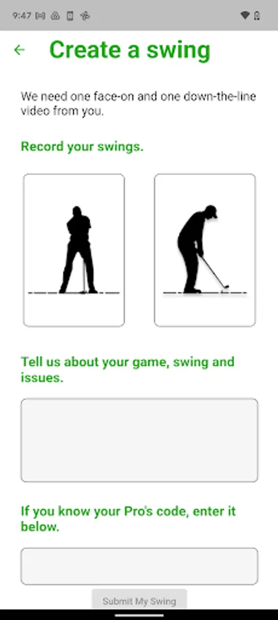 Tell our app about your game, your issues, your problems and the things you want to improve and submit your swing.