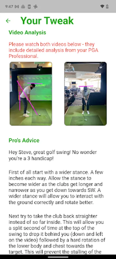 A qualified, and enthusiastic, PGA Professional will then pick up your swing and provide you with incredible narrated, marked up and thoughtful video analysis on your swing.They'll help you understand what is causing your issues, the major concepts in the golf swing, and how to fix the specific things causing the problems in your swing.