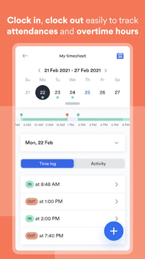 • Clock-in and clock-out from the app dashboard to count the hours and minutes worked, to create accurate digital timesheets, and record overtime
