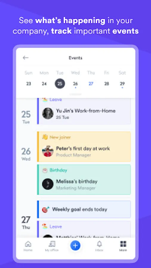 • Stay up-to-date with an organisation’s calendar - Upcoming holidays, colleagues on leave, birthdays, and more.