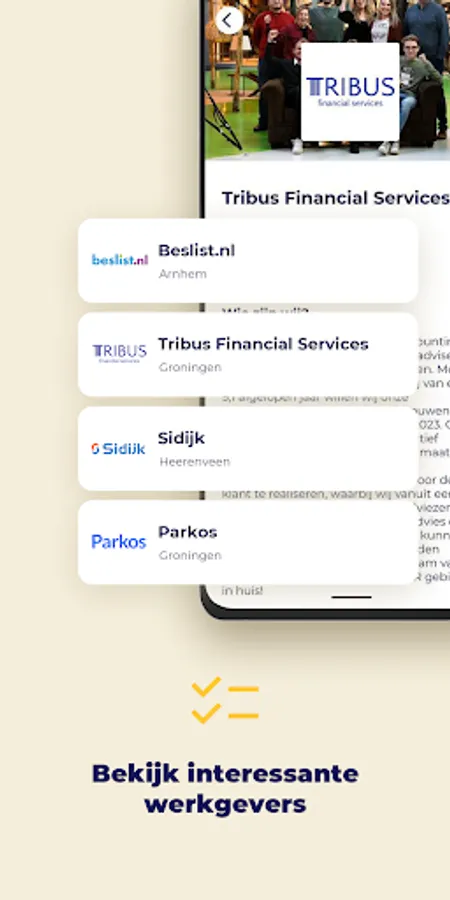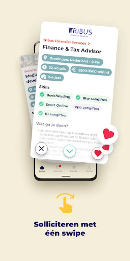 * Do you see a vacancy that appeals to you? Then simply give it a swipe to the right: like. You have now applied! If you don't find a vacancy interesting, swipe it to the left.