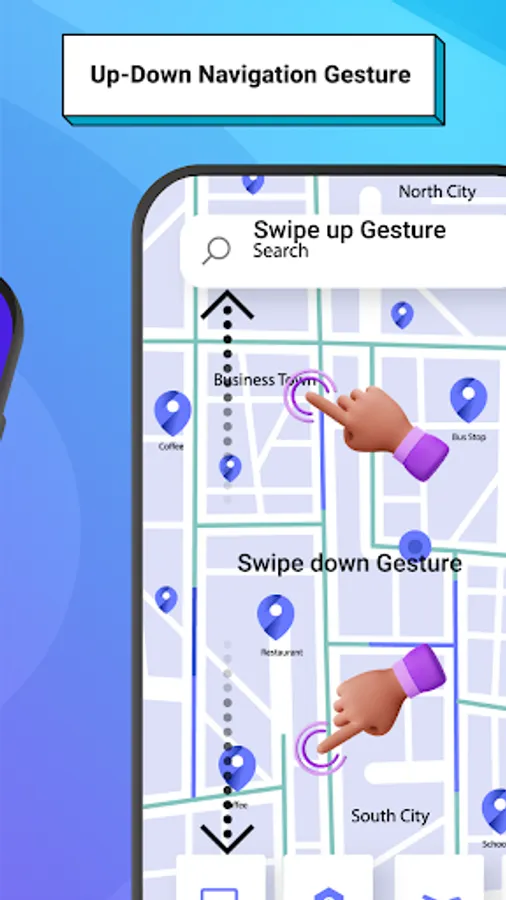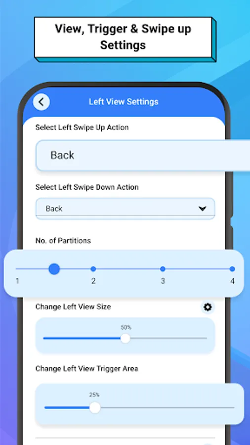 In the left navigation gesture, right navigation gesture and bottom navigation gesture you can add different actions like select up and down swipe action, number of splits, change size, change trigger area and change color of gesture view.
