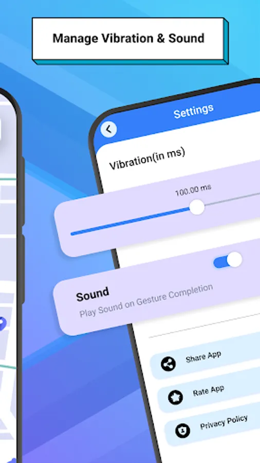 Swipe Back Navigation Gestureapp gives setting option to ENABLE/DISABLE gesture sound and vibration time in millisecond.