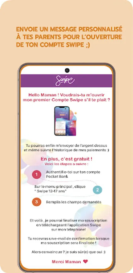 Swipe is the first 100% online banking offer dedicated to young people aged 12 to 17, which allows them to manage their pocket money through a dedicated application (Swipe by Banque Populaire) as well as a personalized bank card.