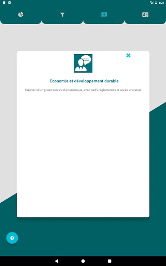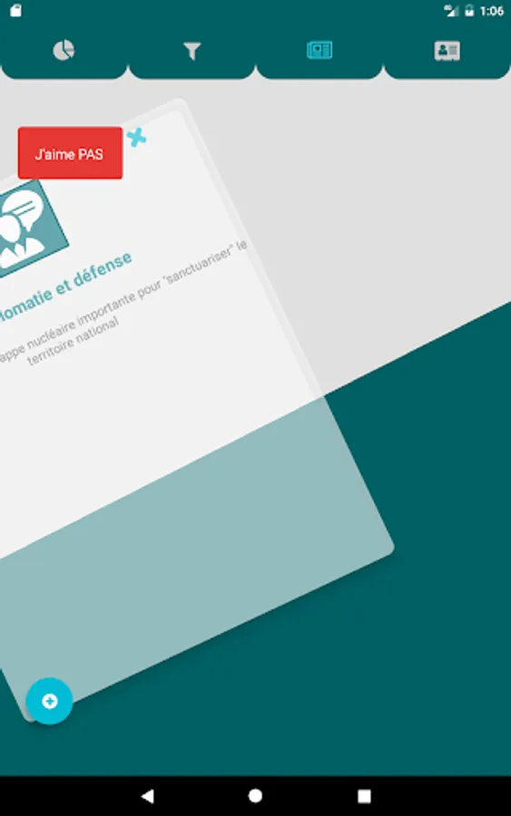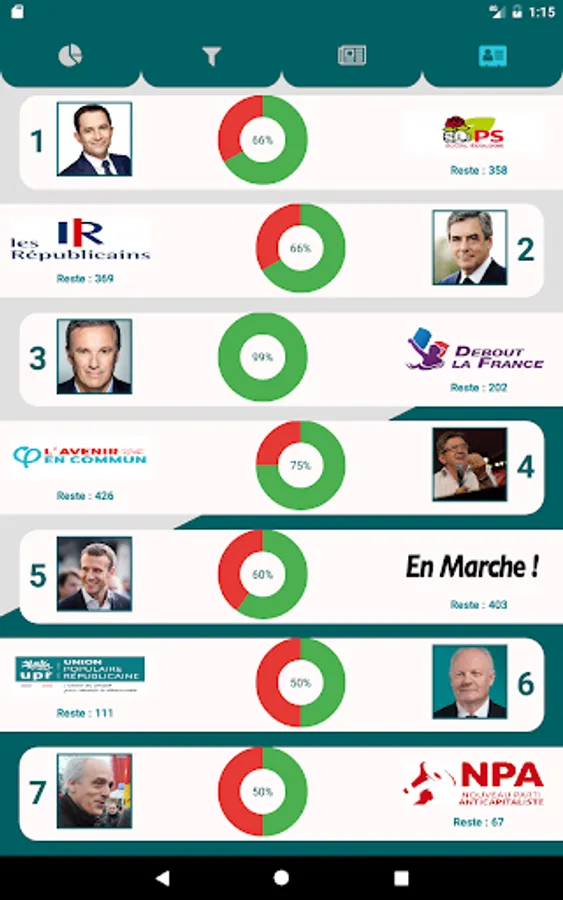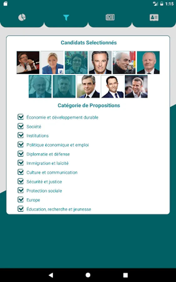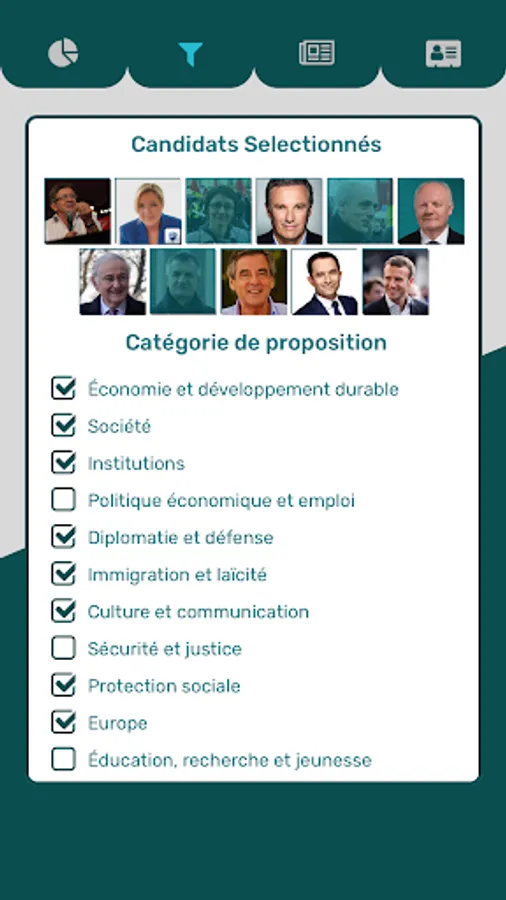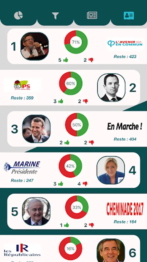 The application allows swiper between different cards containing various information about the presidential program of your favorite candidates.