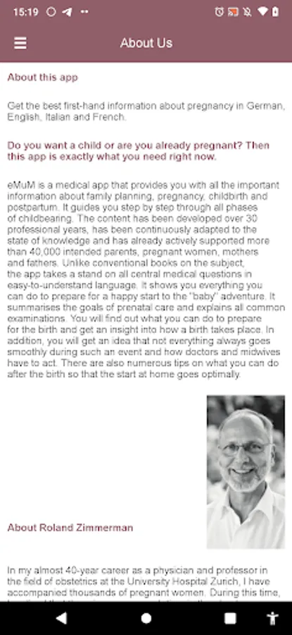 eMuM is a medical app that provides you with all the important information about family planning, pregnancy, childbirth and postpartum. It guides you step by step through all phases of childbearing. The content has been developed over 30 professional years, has been continuously adapted to the state of knowledge and has already actively supported more than 40,000 intended parents, pregnant women, mothers and fathers. Unlike conventional books on the subject, the app takes a stand on all central medical questions in easy-to-understand language. It shows you everything you can do to prepare for a happy start to the "baby" adventure. It summarises the goals of prenatal care and explains all common examinations. You will find out what you can do to prepare for the birth and get an insight into how a birth takes place. In addition, you will get an idea that not everything always goes smoothly during such an event and how doctors and midwives have to act. There are also numerous tips on what you can do after the birth so that the start at home goes optimally.