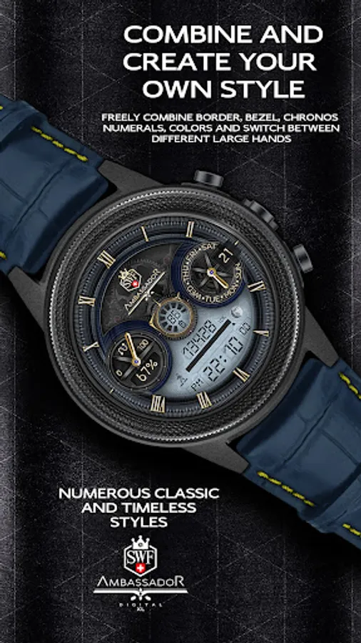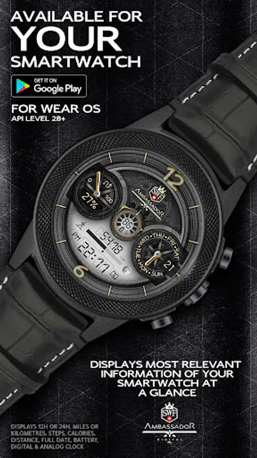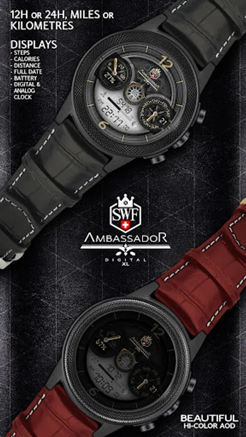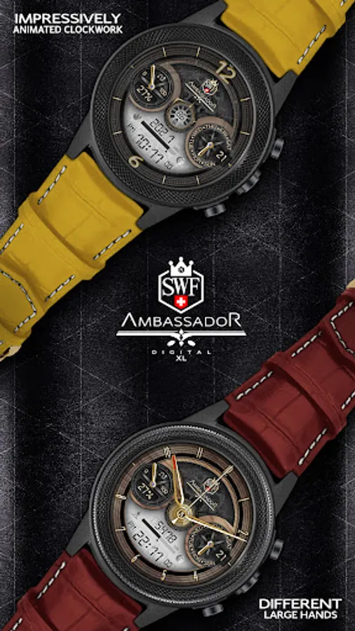 SWF Swiss Watch Faces are crafted and made in Switzerland and showing an very high grade of details. The SWF Ambassador contains a beautiful animated clockwork and a high color AOD watch face for your watch, so you can leave your watch always on while you are on the go.