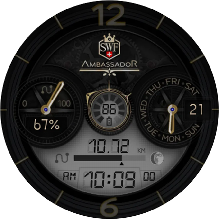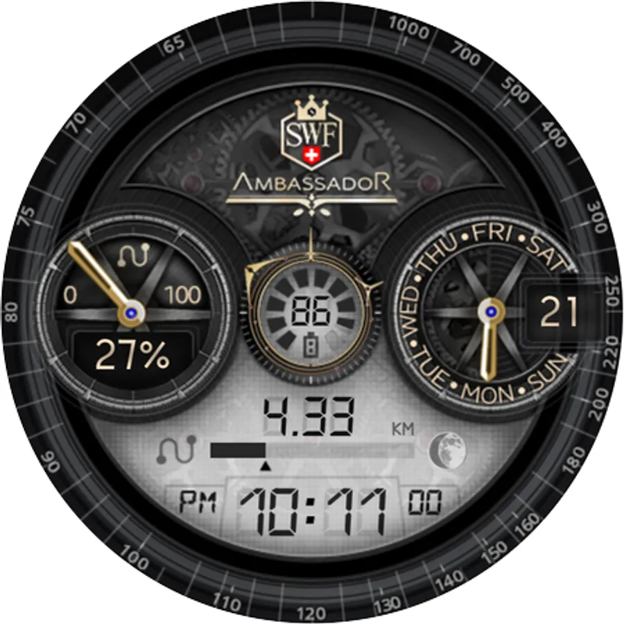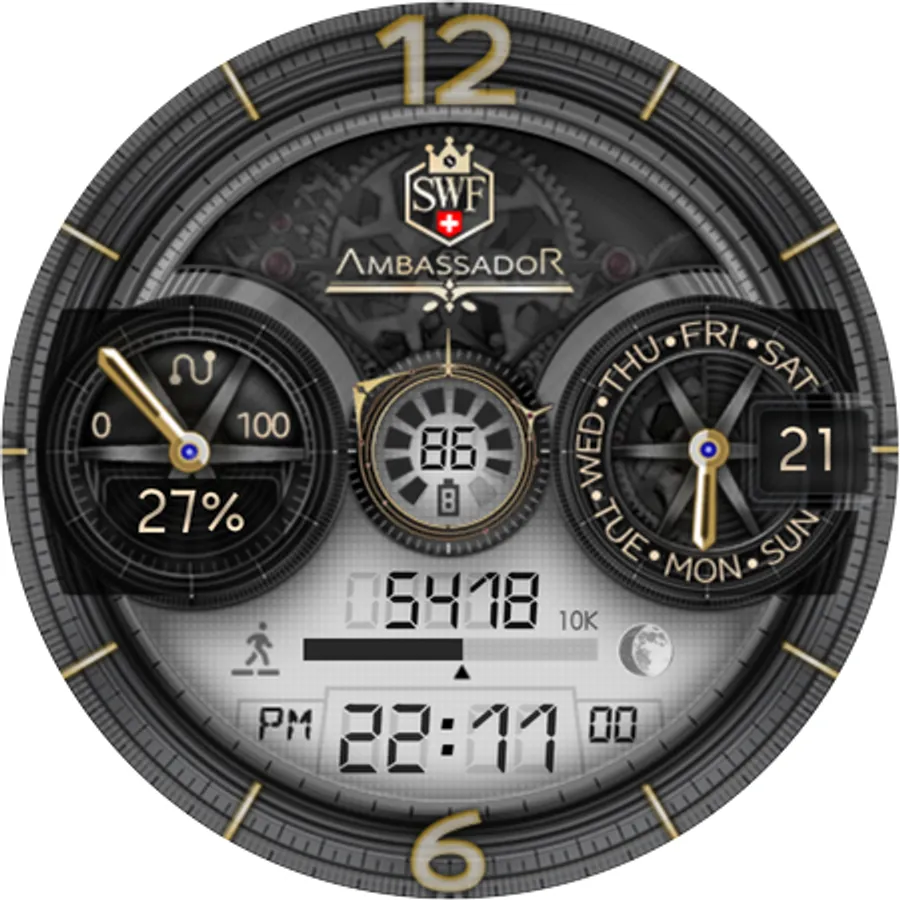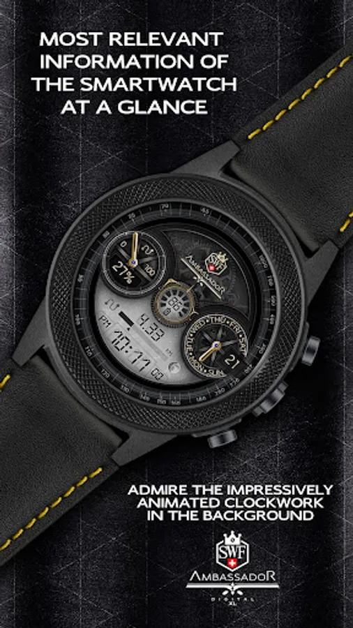 With it's clear and modern design, the SWF Ambassador XL digital watch face is built to guide you through the time of each day. Admire the impressively animated clockwork in the background while in the foreground most smartwatch information within the watch face are displayed at a glance.