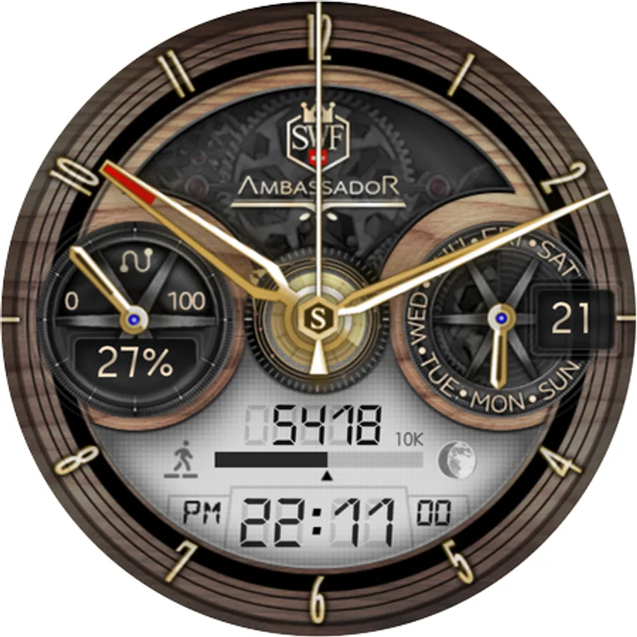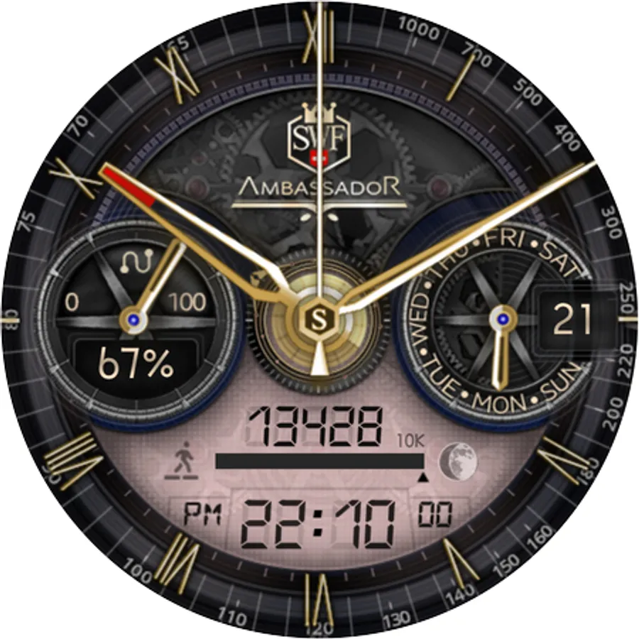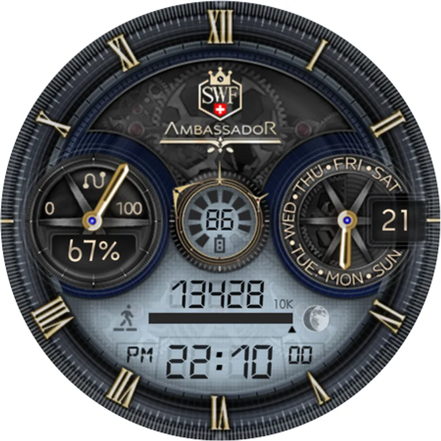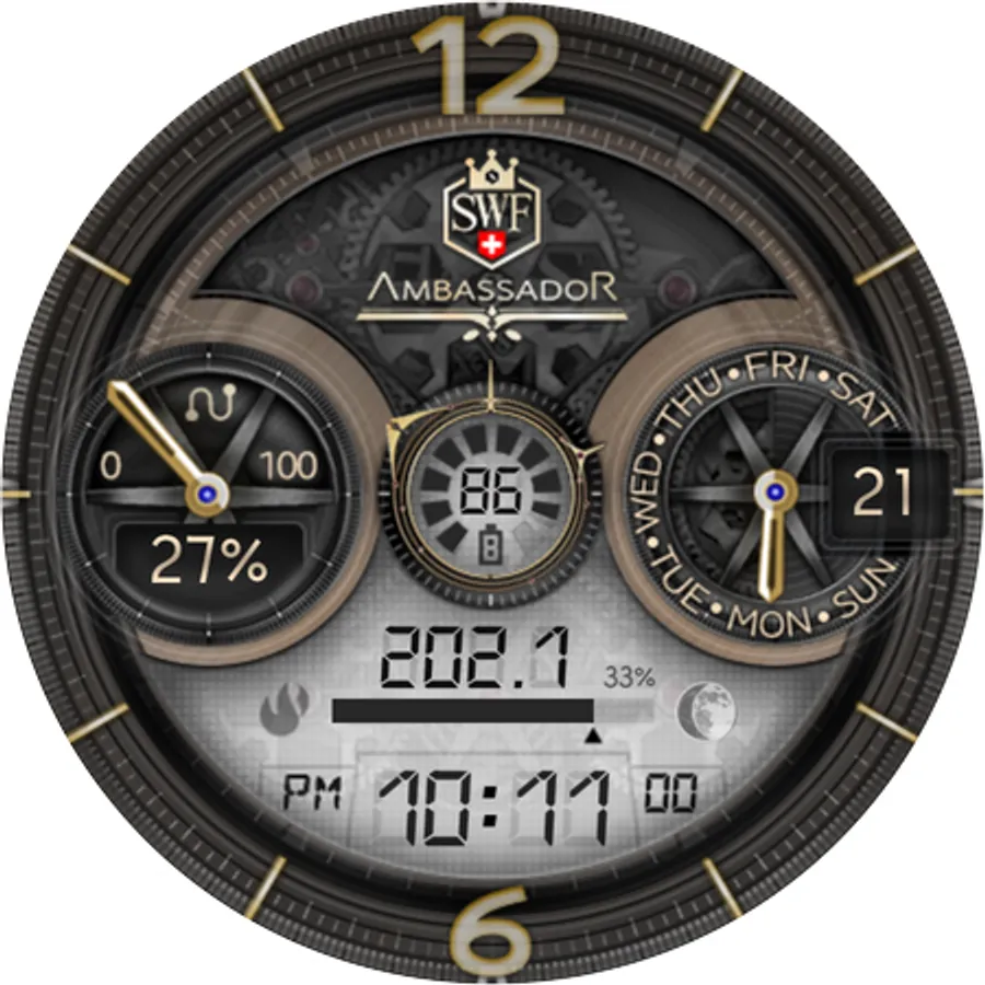 With it's clear and modern design, the SWF Ambassador XL digital watch face is built to guide you through the time of each day. Admire the impressively animated clockwork in the background while in the foreground most smartwatch information within the watch face are displayed at a glance.