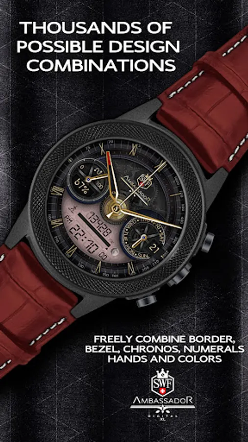 The SWF Ambassador XL digital watch face impresses with a detailed animated clockwork and allows you to create thousands of different combinations by freely combining border, bezel, chronos, numerals, hands and colors. The PRO Series allows you to configure up to 8 custom apps on your digital watch face.