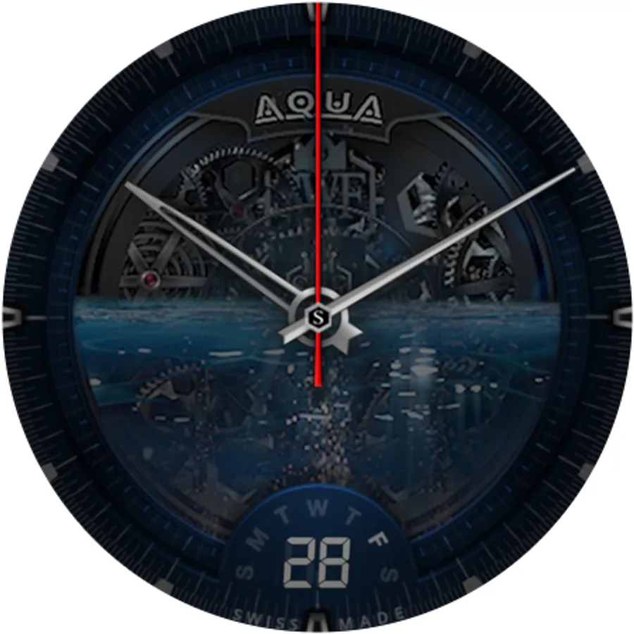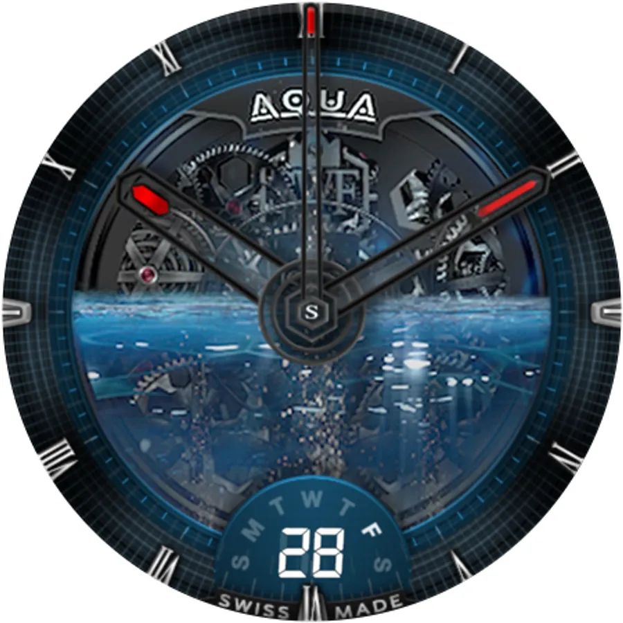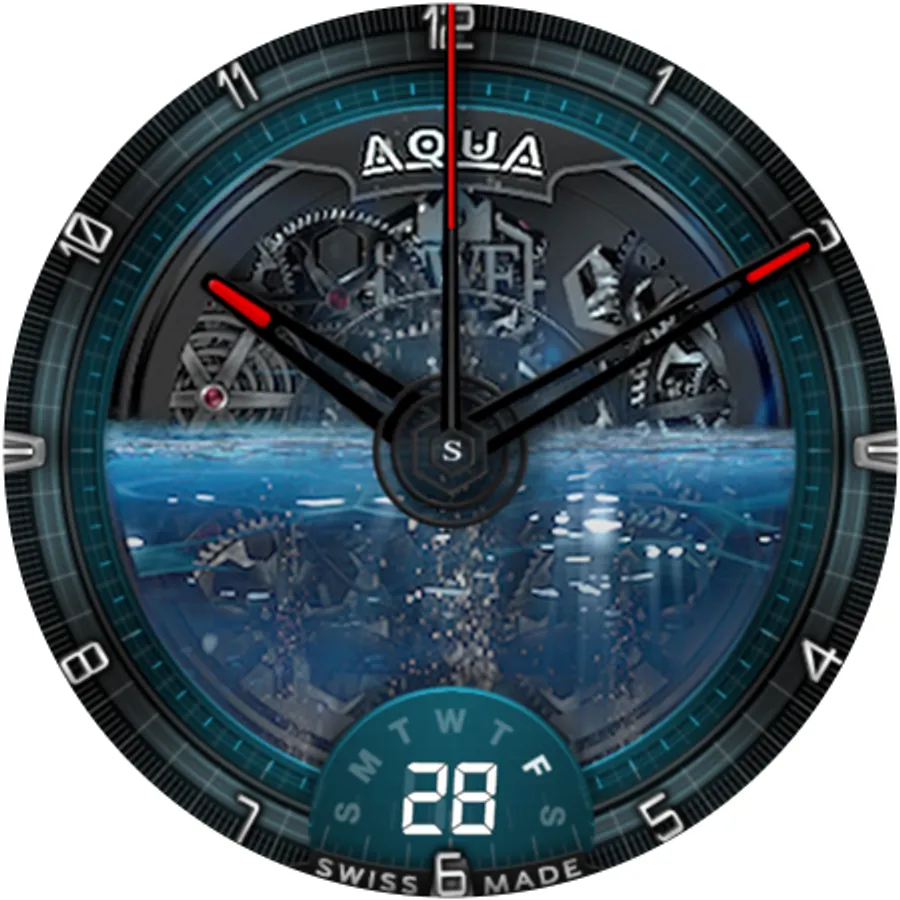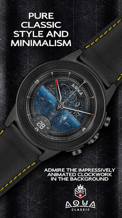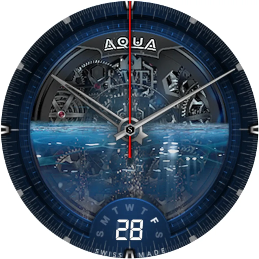 The SWF Aqua Classic watch face impresses with a detailed animated clockwork and allows you to create thousands of different combinations by freely combining border, bezel, numerals, hands, colors and more.